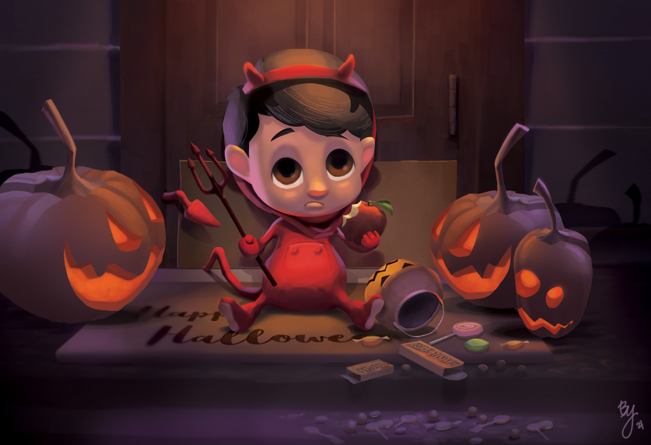 What's the worst thing that could happen on Halloween? This little devil had his night ruined when he spilled all of his candy and he's stuck with nothing but an apple!